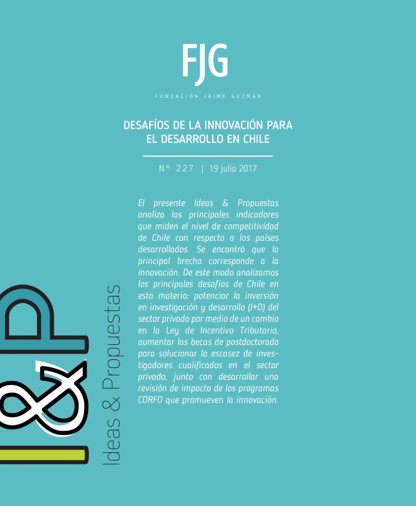 Desafíos de la innovación para el desarrollo en Chile Comunicaciones FJG Ideas & Propuestas 19 julio 20175 abril 2018Chile, CORFO, Desarrollo, Emprendimiento, I+D, Innovación El presente Ideas & Propuestas analiza los principales indicadores que miden el nivel de competitividad de Chile con respecto a los países desarrollados. Se encontró que la principal brecha corresponde a la innovación.